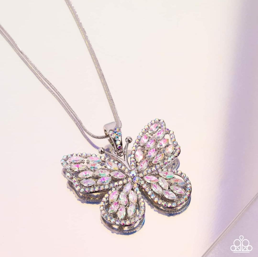 Dotted in iridescent marquise-cut rhinestones, an airy whimsical silver butterfly flutters along a dainty silver snake chain below the collar in an enchanting fashion. Dainty white iridescent rhinestones glitz across the top of the pendant and the frame of the butterfly, accentuating the dazzling kaleidoscope of color within the wings. Features an adjustable clasp closure. Due to its prismatic palette, color may vary.