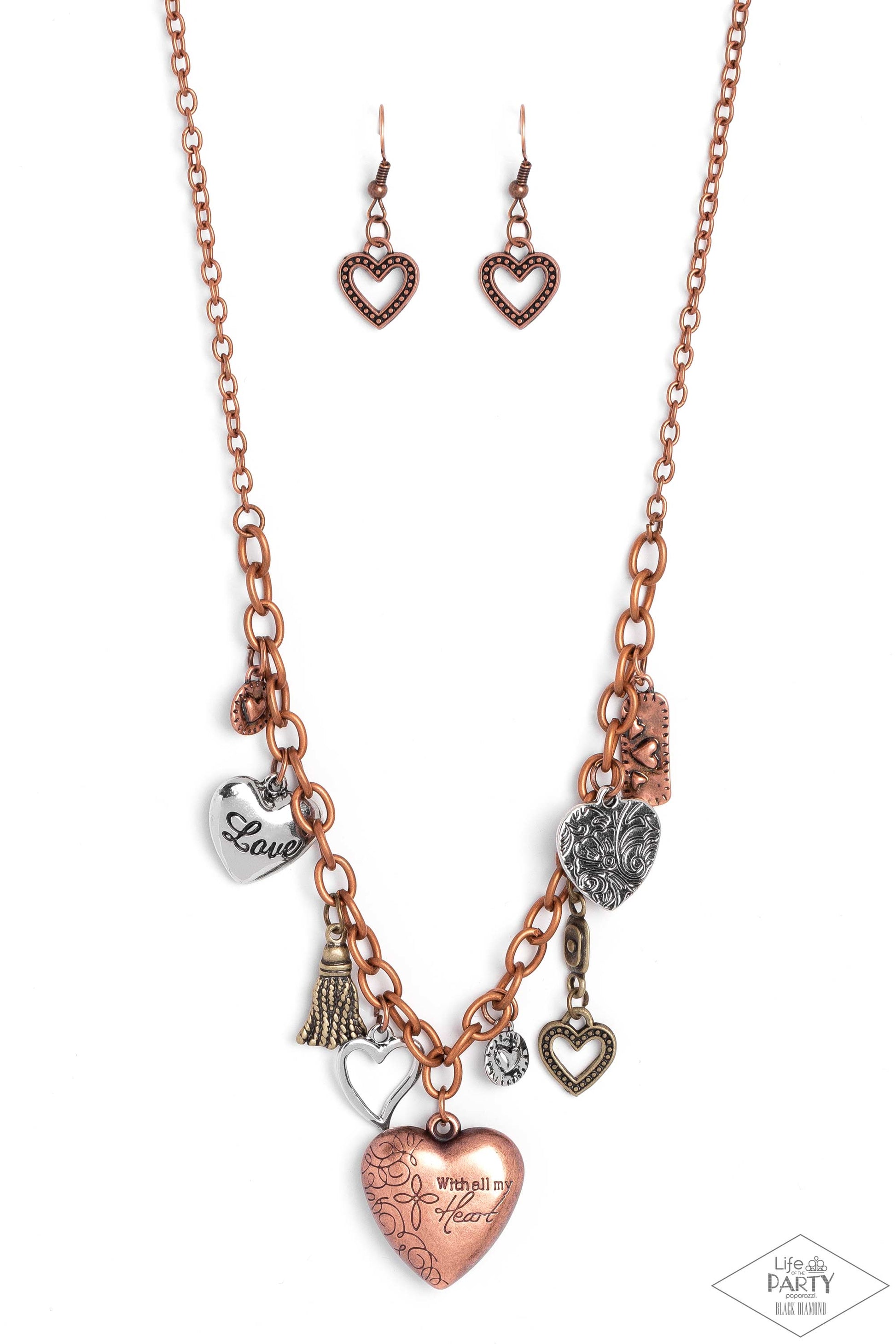 An array of brass, copper, and silver heart charms trickle from a section of bold copper chain, creating a whimsical fringe below the collar. The largest heart charm is inscribed with the phrase, “With all my heart” on one side and a short bible verse on the other that reads, "Love the lord thy God with all your heart. Luke 10:27.” Features an adjustable clasp closure.